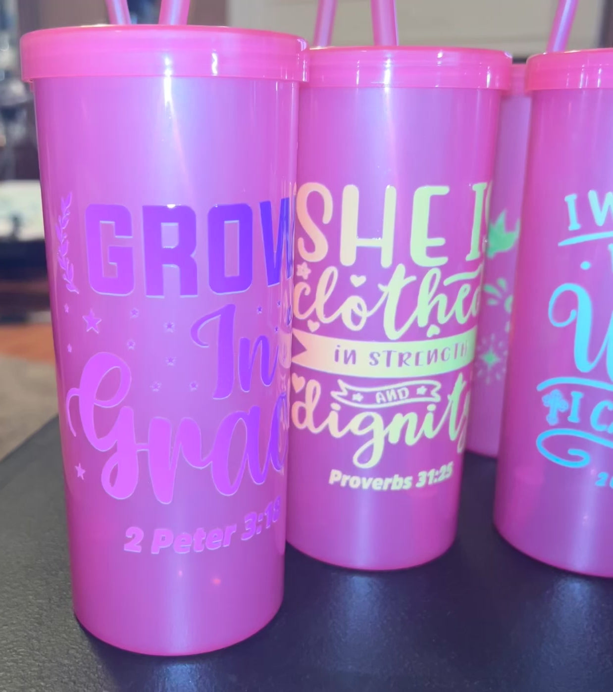 These tumblers are perfect reminders of God’s love for women of God. Each tumbler is 20 oz with a screw top lid and straw. Beautifully designed with bright and vivid scriptures. Perfect gift for any woman or young girl of faith.